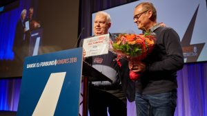 Forbundsformand Jørgen Juul Rasmussen (tv.) overrækker el-forbundets kulturpris. (Foto: DEF, Henrik Bjerregrav)
