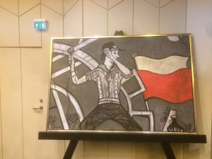 Og selv om man ikke herude kan øjne en eneste rød arbejderfane smælde på denne blanke og vårfriske dag, så dukker den op indendørs i forbindelse med eftermiddagens store begivenhed, nemlig afsløringen af en moderne nyfortolkning af det klassiske og meget ikoniske maleri ‘Agitatoren’, af billedkunstneren Erik Henningsen