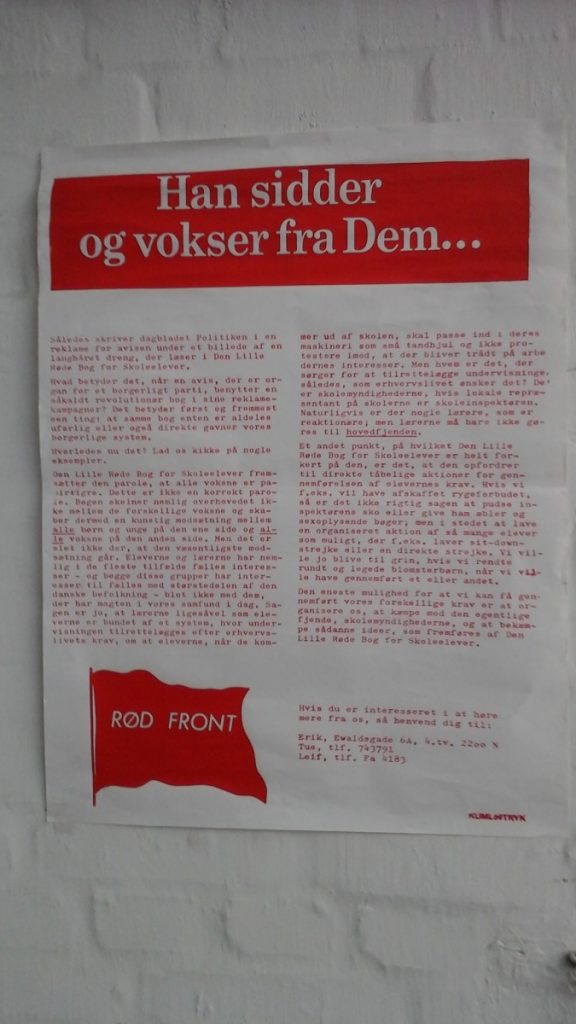 Samtidigt med plakaten fulgte en lille stencileret flyer, hvori KUML spurgte: ”Den lille røde bog for skoleelever” progressiv eller reaktionær?