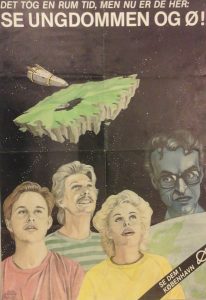 Rum-konceptet var oplagt og indeholdt et billedunivers, folk allerede kendte. Det var rumskibets designer Mads Rye, som stod bag plakaten. Han forevigede sig selv iført stribet T-shirt og fik selskab af to venner – et søskendepar – Jan og Anette. Manden med det grønne ansigt er Venstres Bertel Haarder, som var undervisningsminister i første omgang det meste af 1980’erne. Han var voldsomt upopulær blandt ungdommen, som ikke mindst i ungdomsåret følte sig svigtet af hans manglende engagement og sympati.
